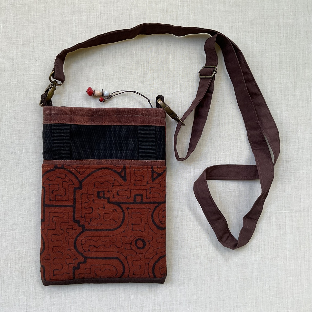 ポシェット89 ピンク刺繍の縦長ファスナー付き ベルト通しつき 15.50x22cm シピボ族の泥染め