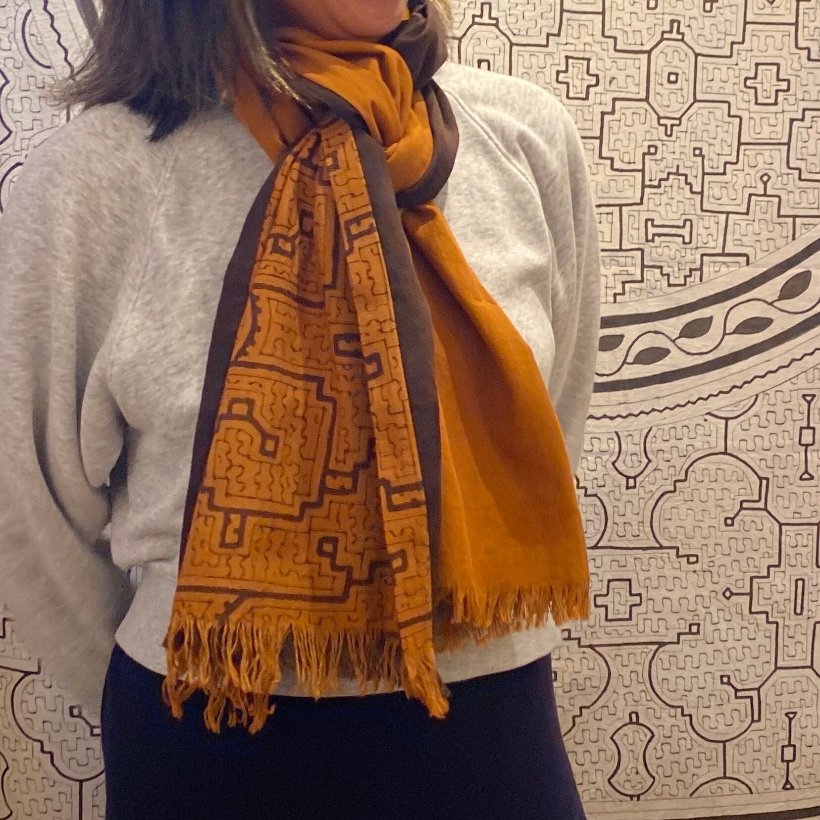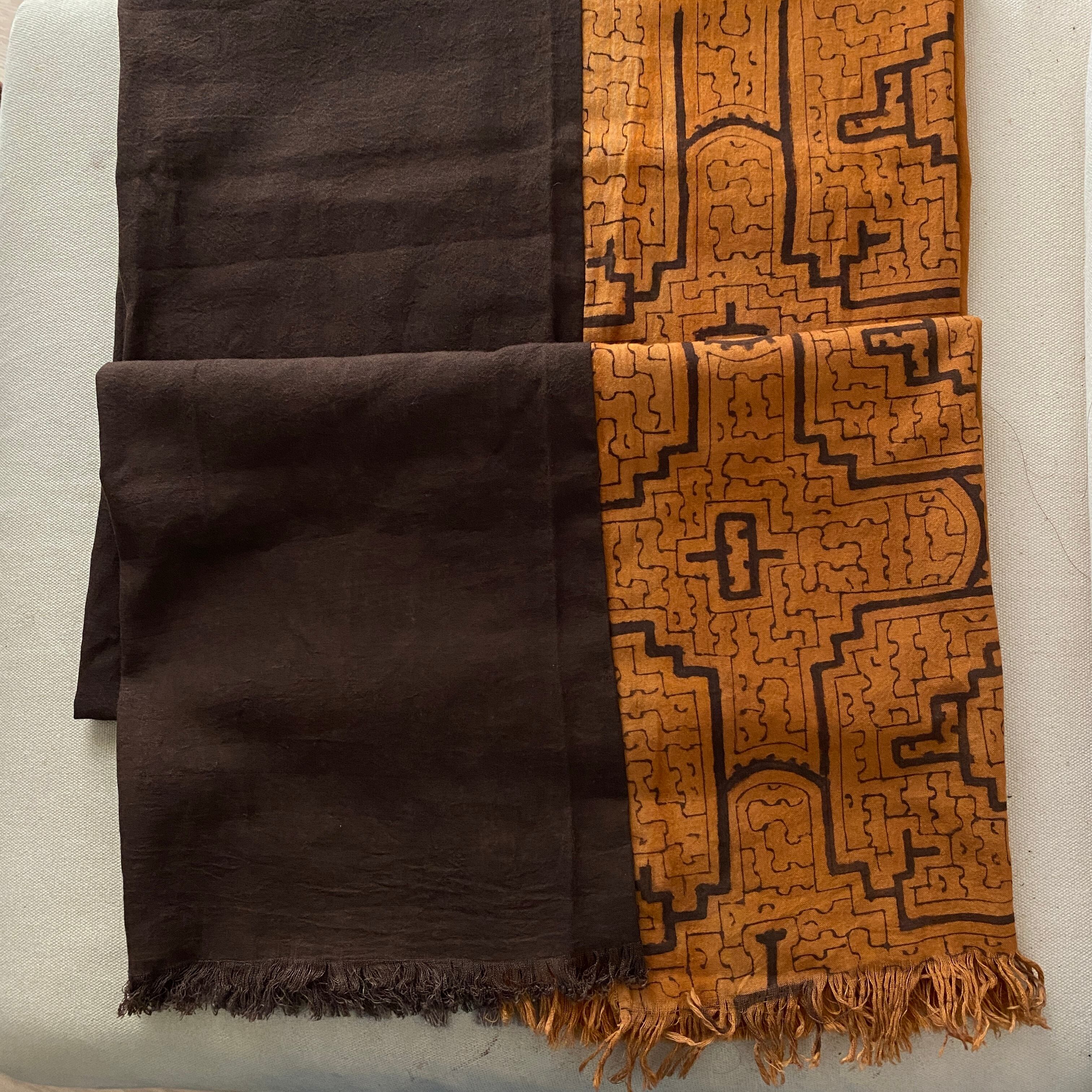 アマゾンの泥染めは、先住民族シピボ族の伝統工芸で、フリーハンドの幾何学模様を染める、希少価値の高い手工芸です。この布を使ってオーナー(AYACHI S)がバッグや布雑貨を手作りしています。 貴重な伝統工芸を少しでも長く作り続けて欲しいという想いから続けている活動です。