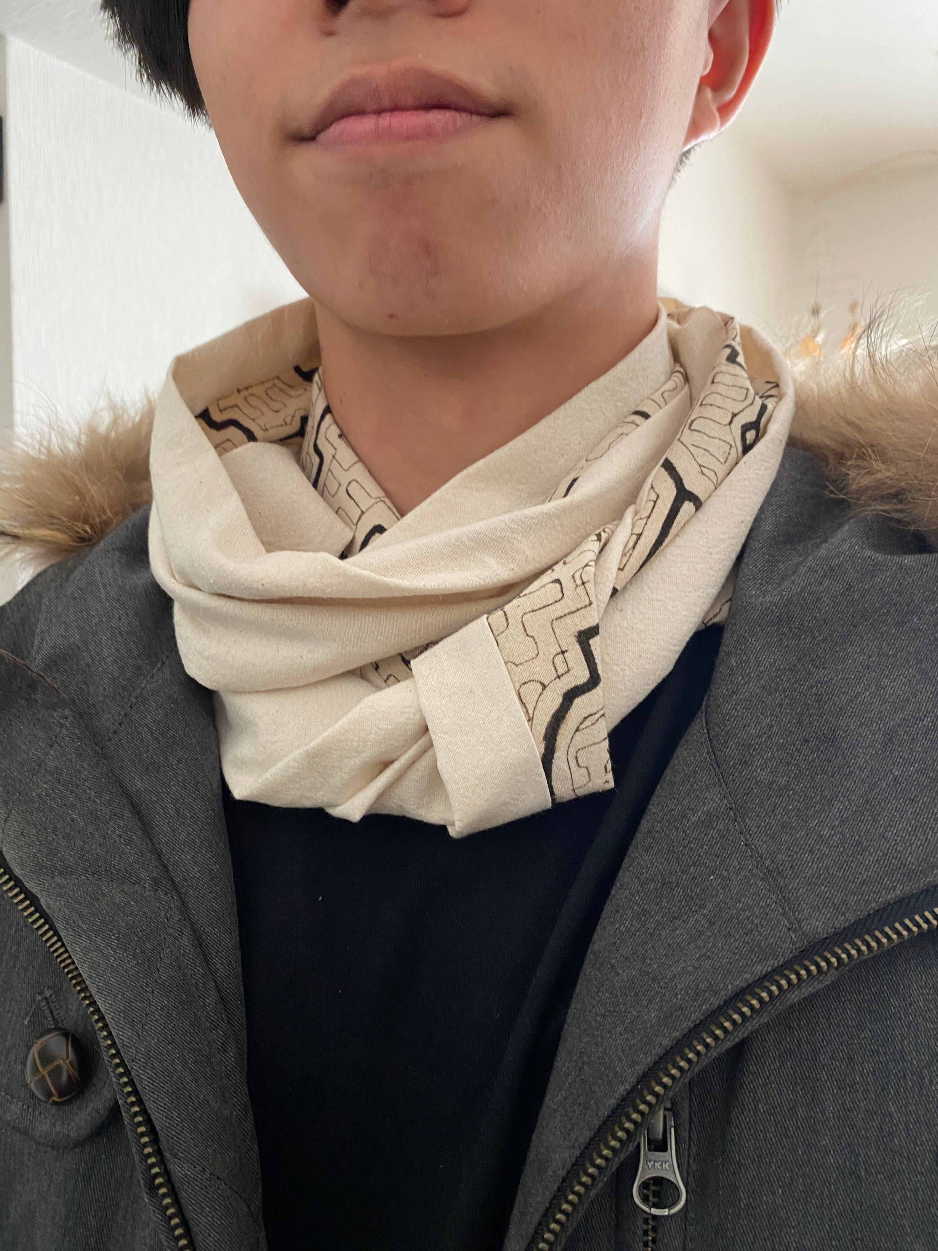 シピボ模様の生地はクリーム色っぽく、泥染めによる黄ばみ、白地は日本製のコットンになります。無地の部分を白にしてサービス商品としました。模様部分はとても美しいものを選んでいます。