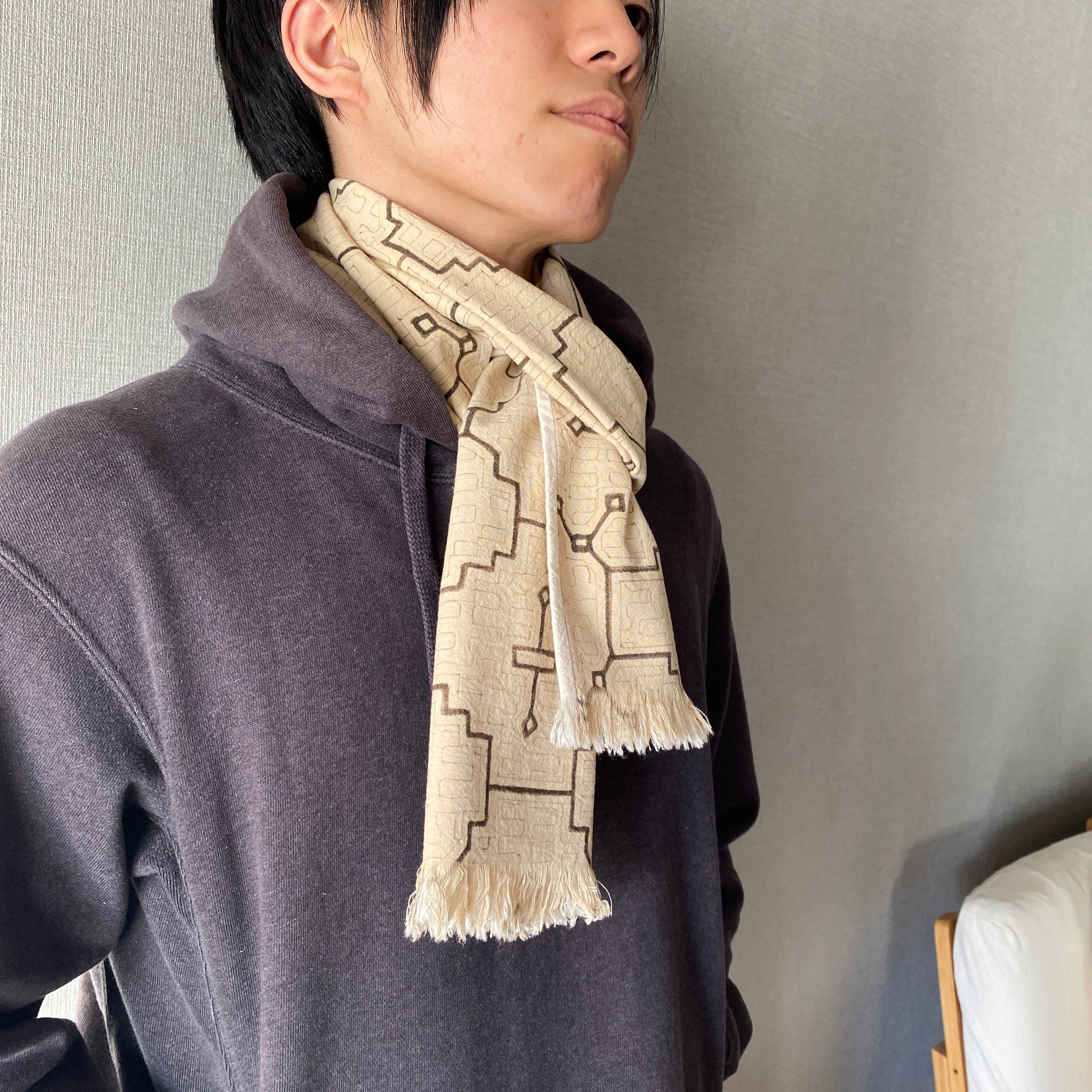 泥染めでベージュに染まっている模様と無地のコットンの淡い2色か爽やか。