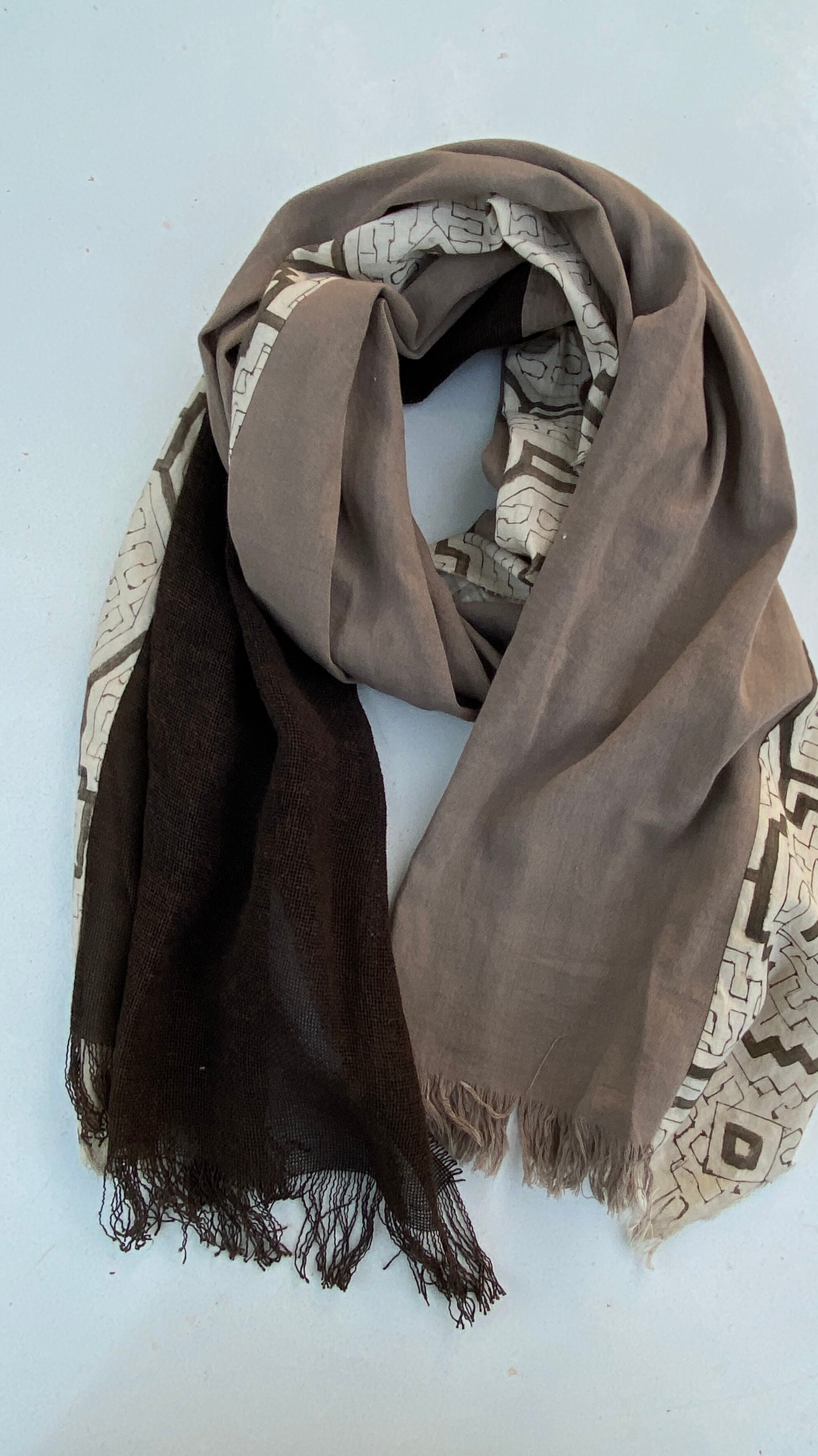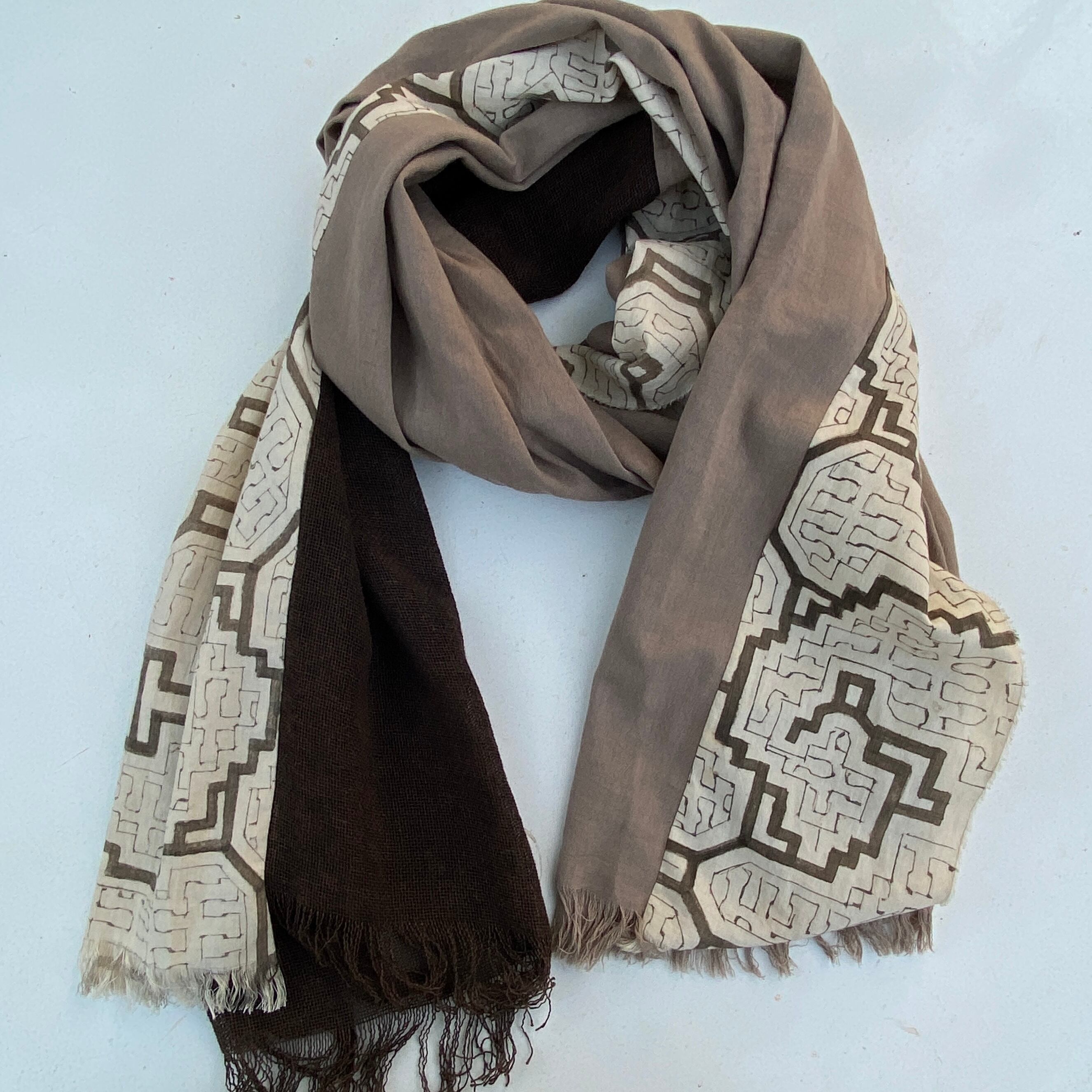 ストール19シピボ模様と泥染めグレーと泥染め黒の麻 57x190cm アマゾン染め