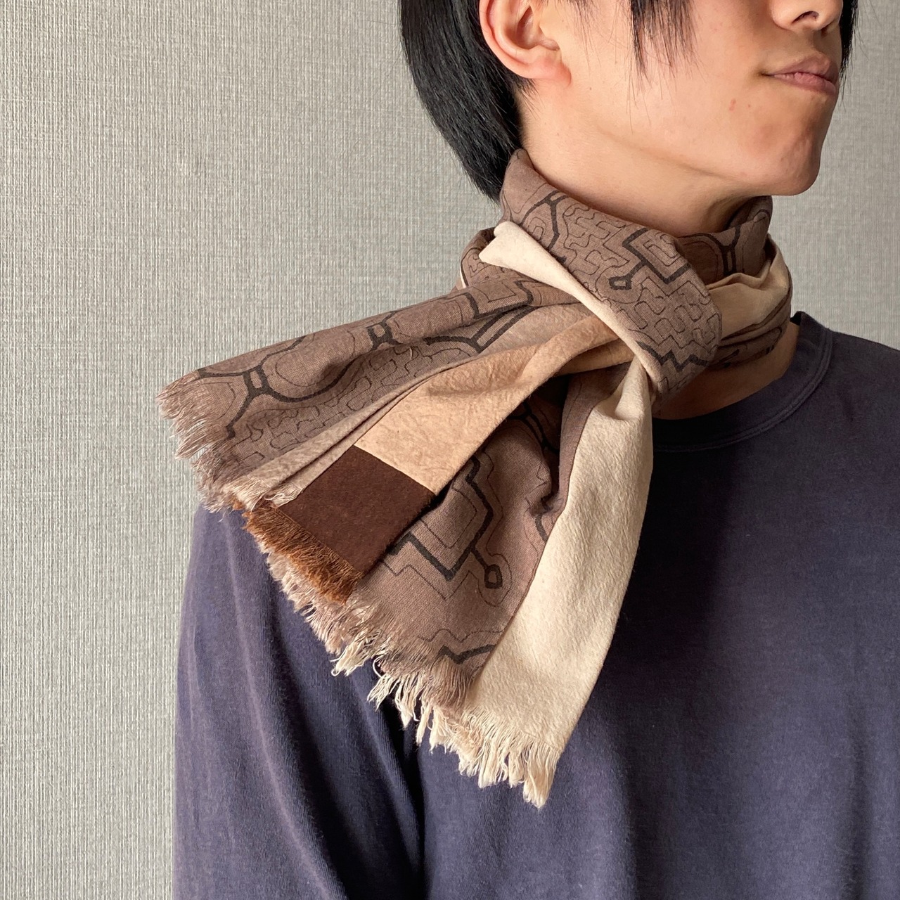 紫系ベージュ系を組み合わせたアマゾンの泥染めならではの色のコラージュストール レア