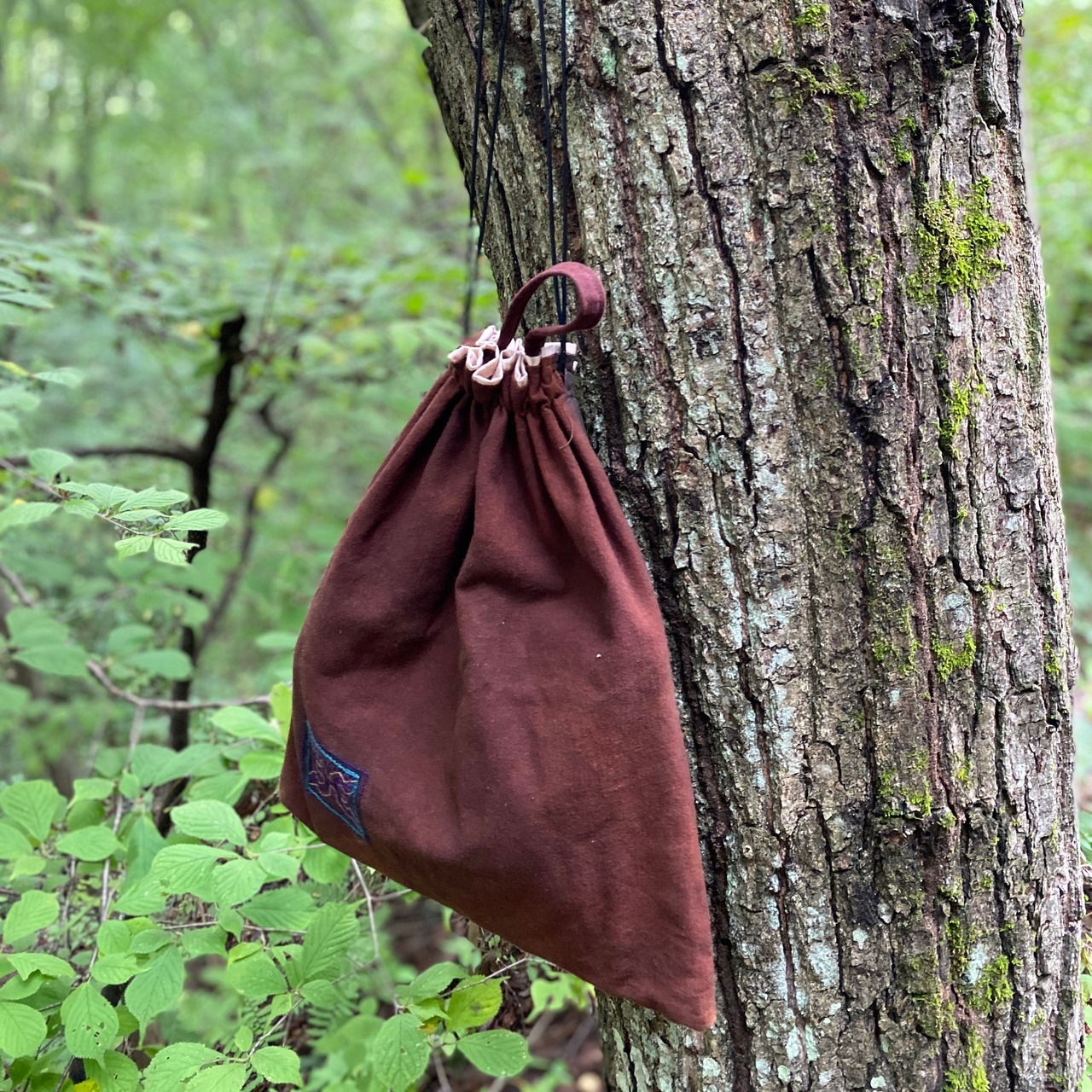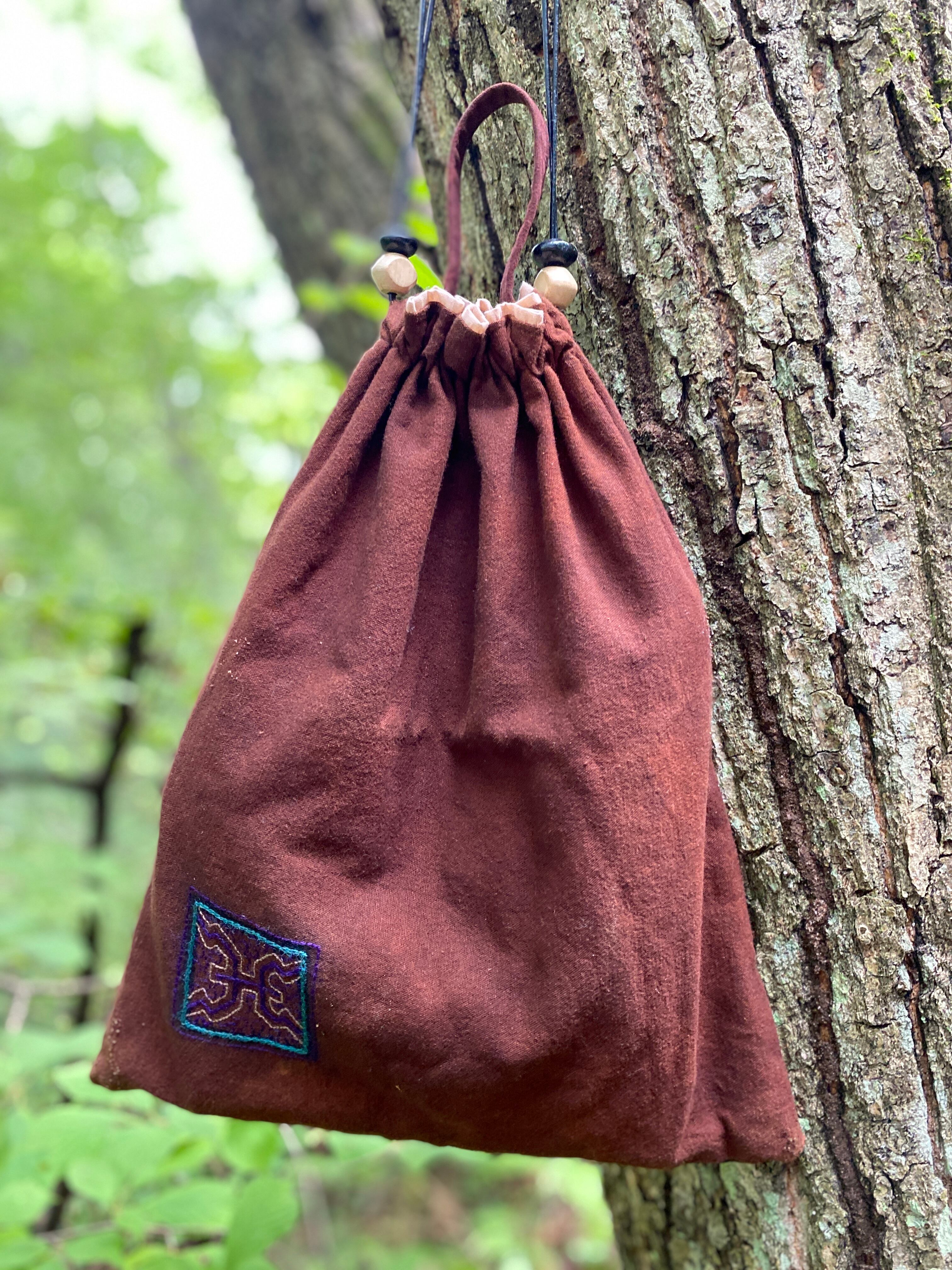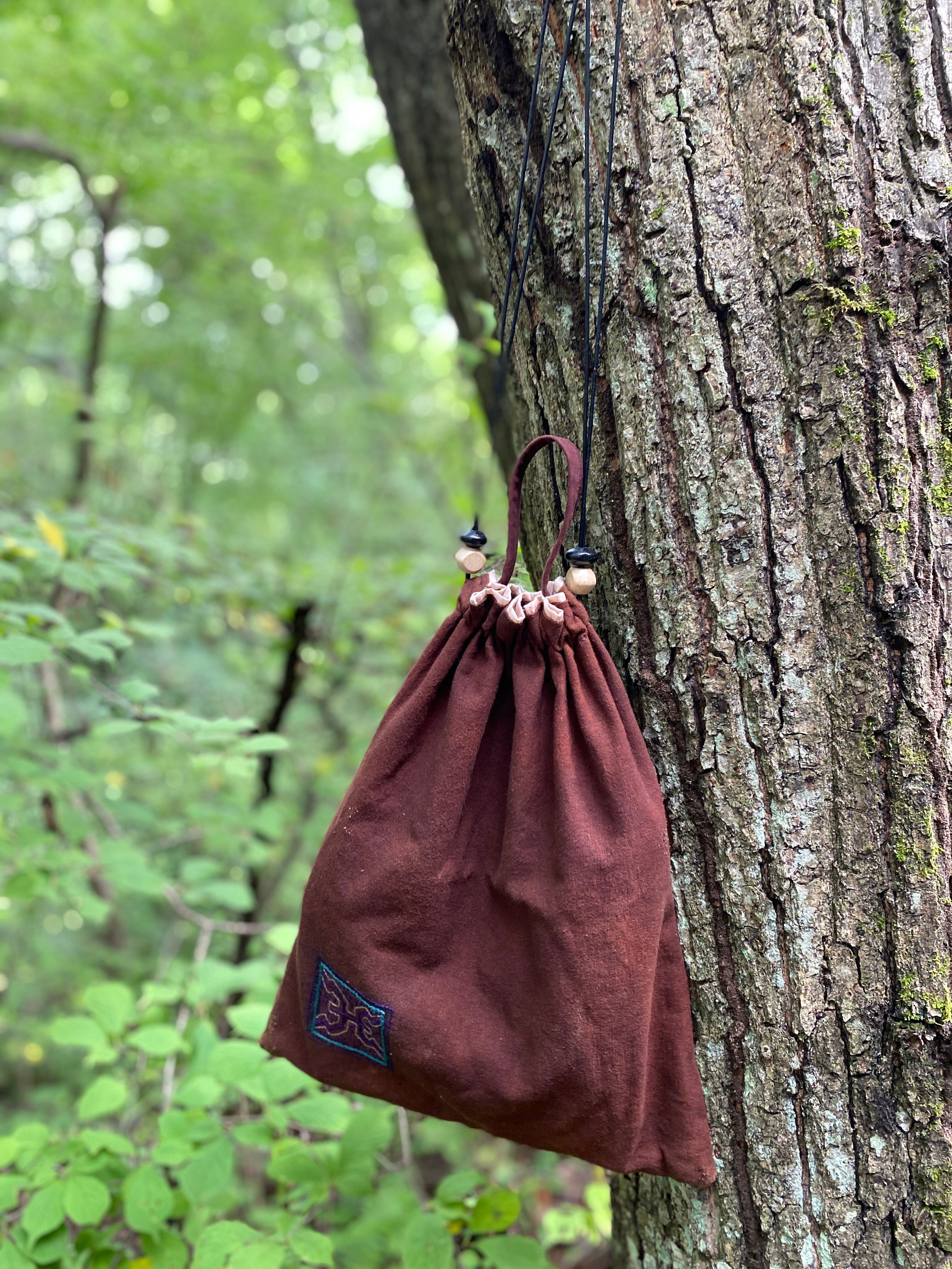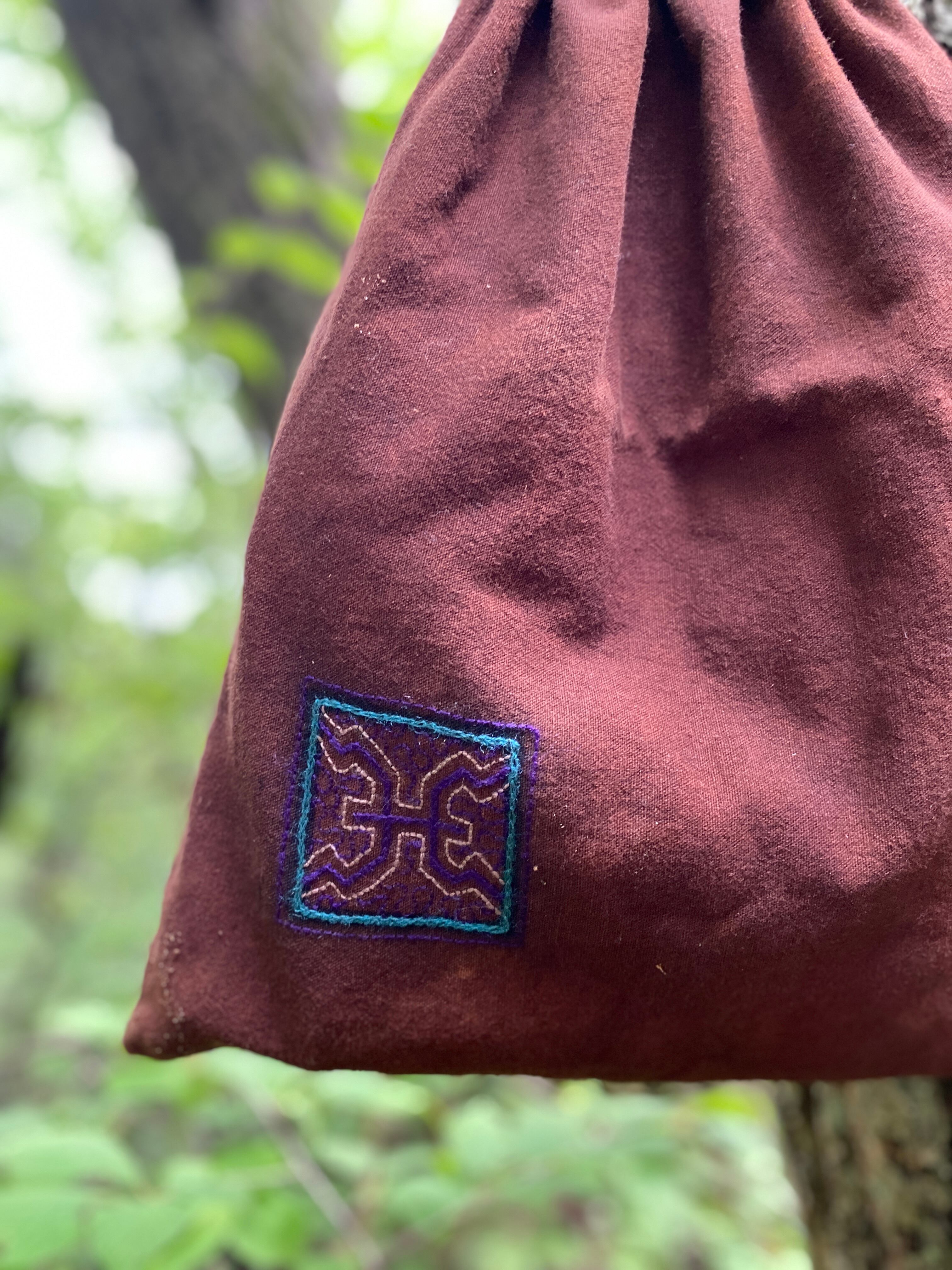 アマゾンの泥染めの黒と焦茶で、片側にワンポイントの刺繍が付いています。巾着袋にして持ち手もつけたのでぶら下げやすく、革の丸紐で滑らかです。