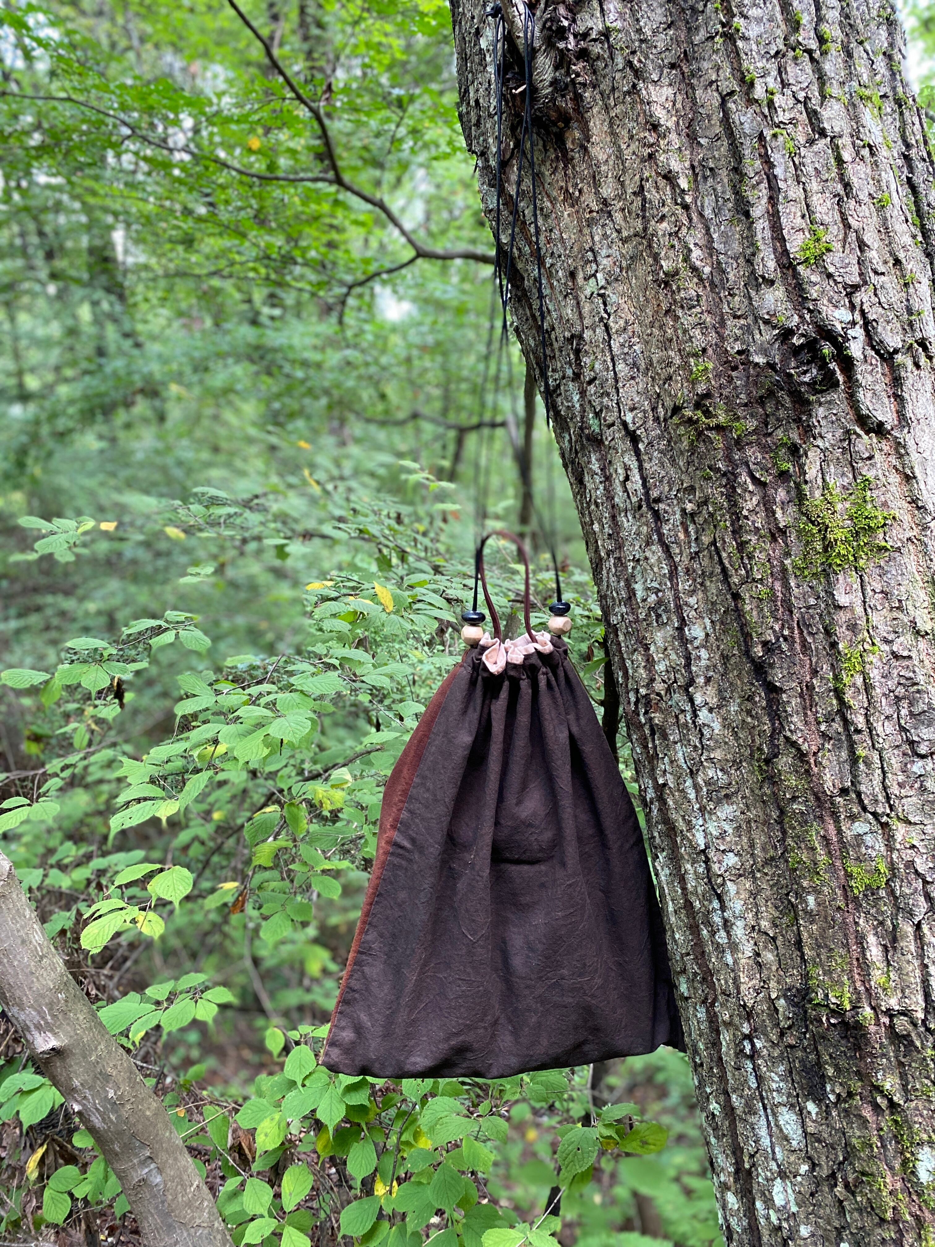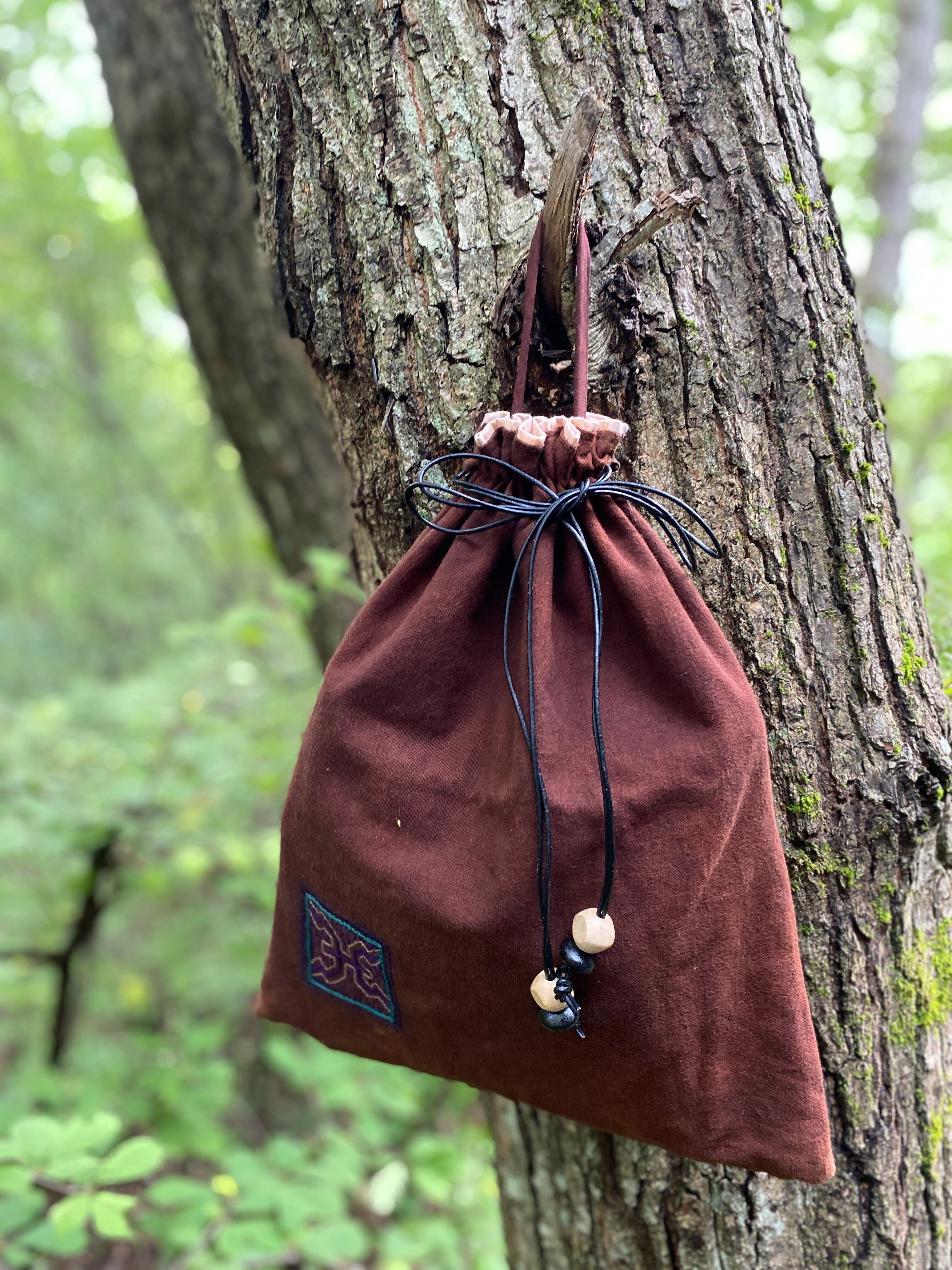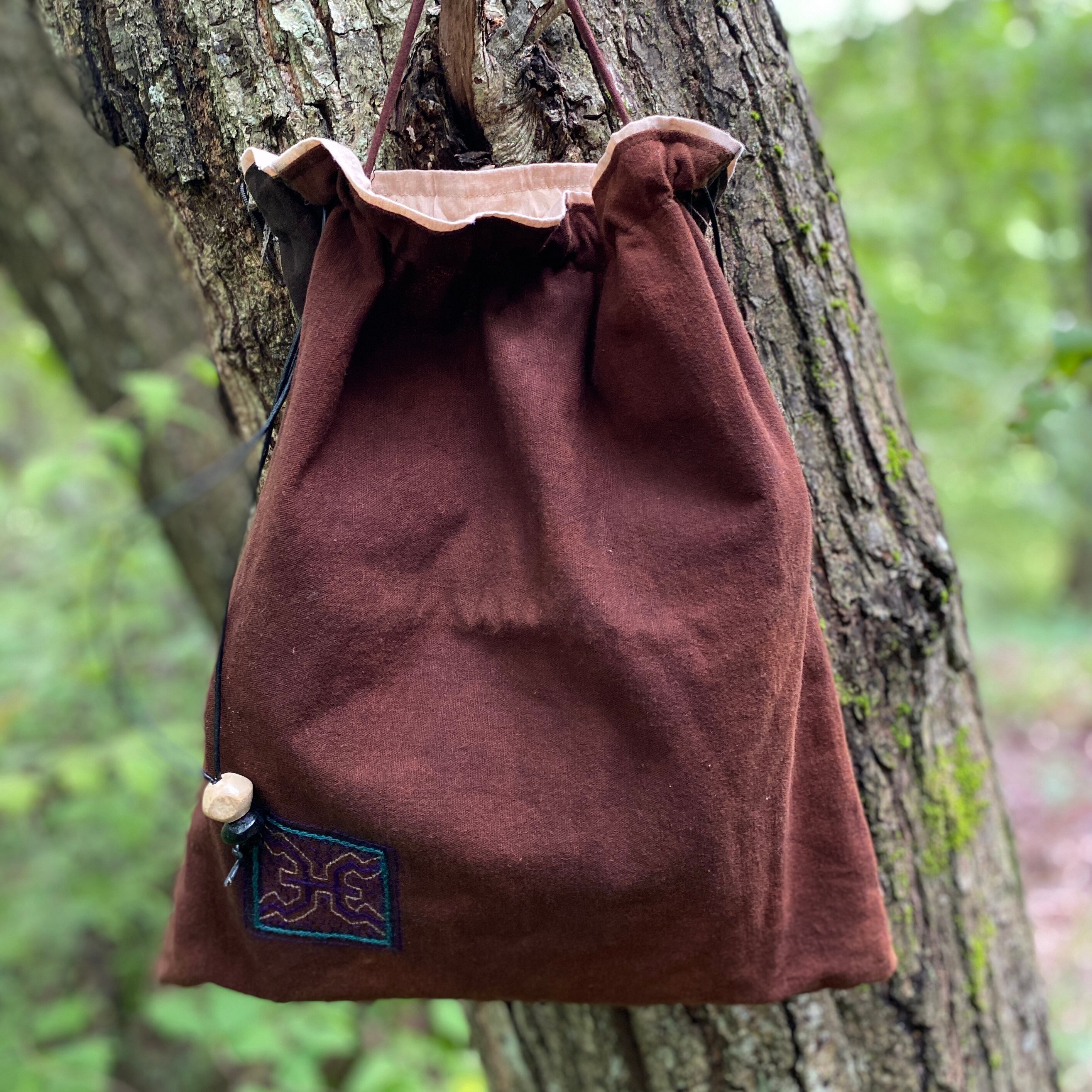 アマゾンの泥染めの黒と焦茶で、片側にワンポイントの刺繍が付いています。巾着袋にして持ち手もつけたのでぶら下げやすく、革の丸紐で滑らかです。