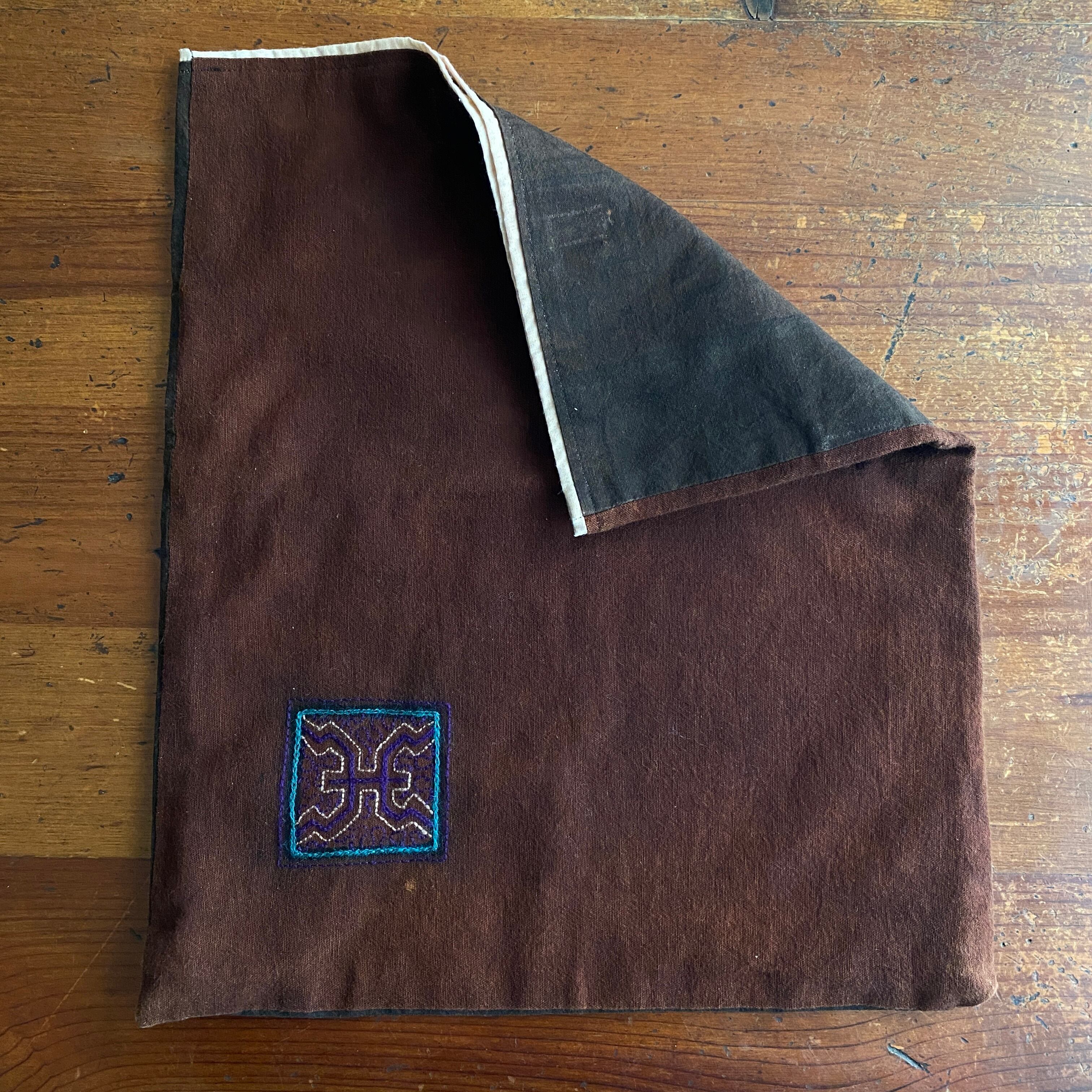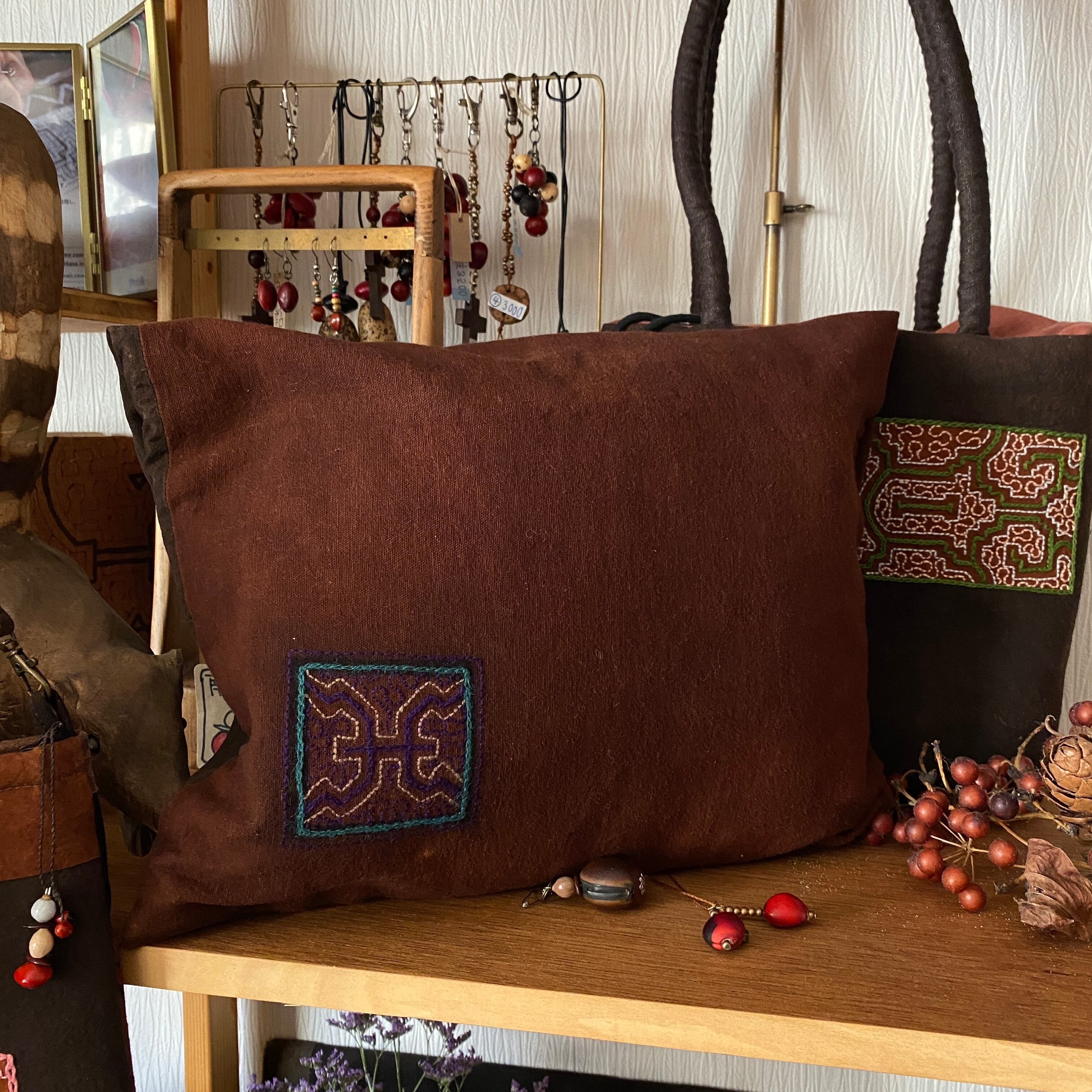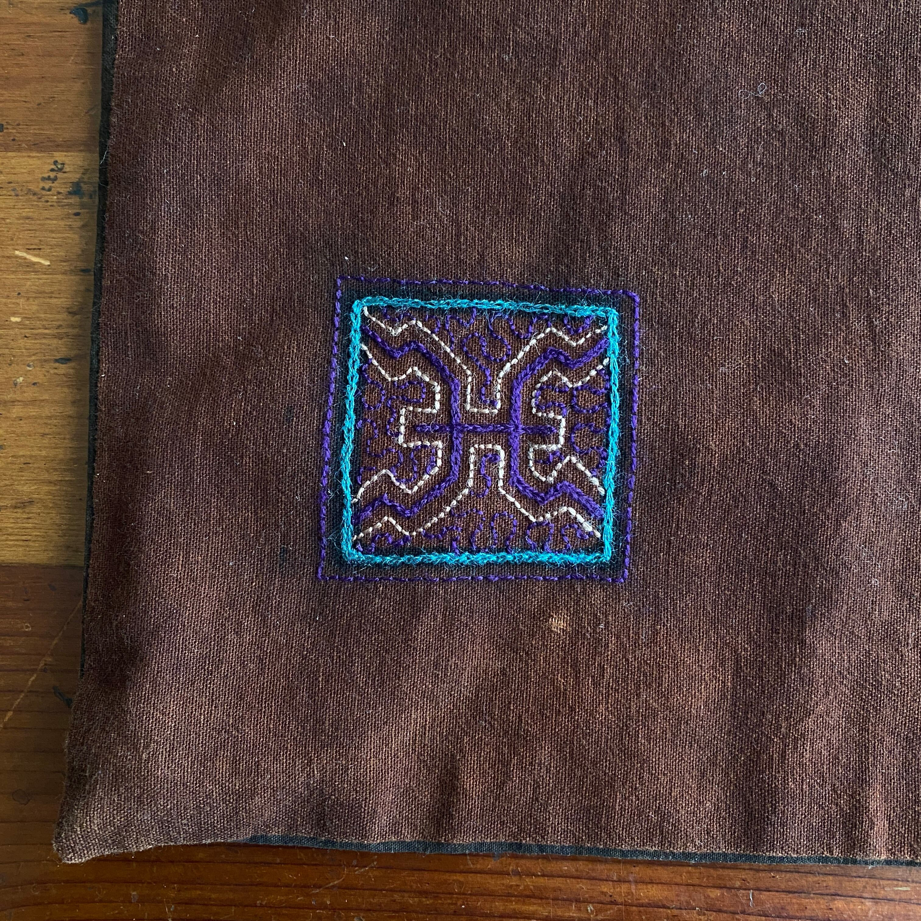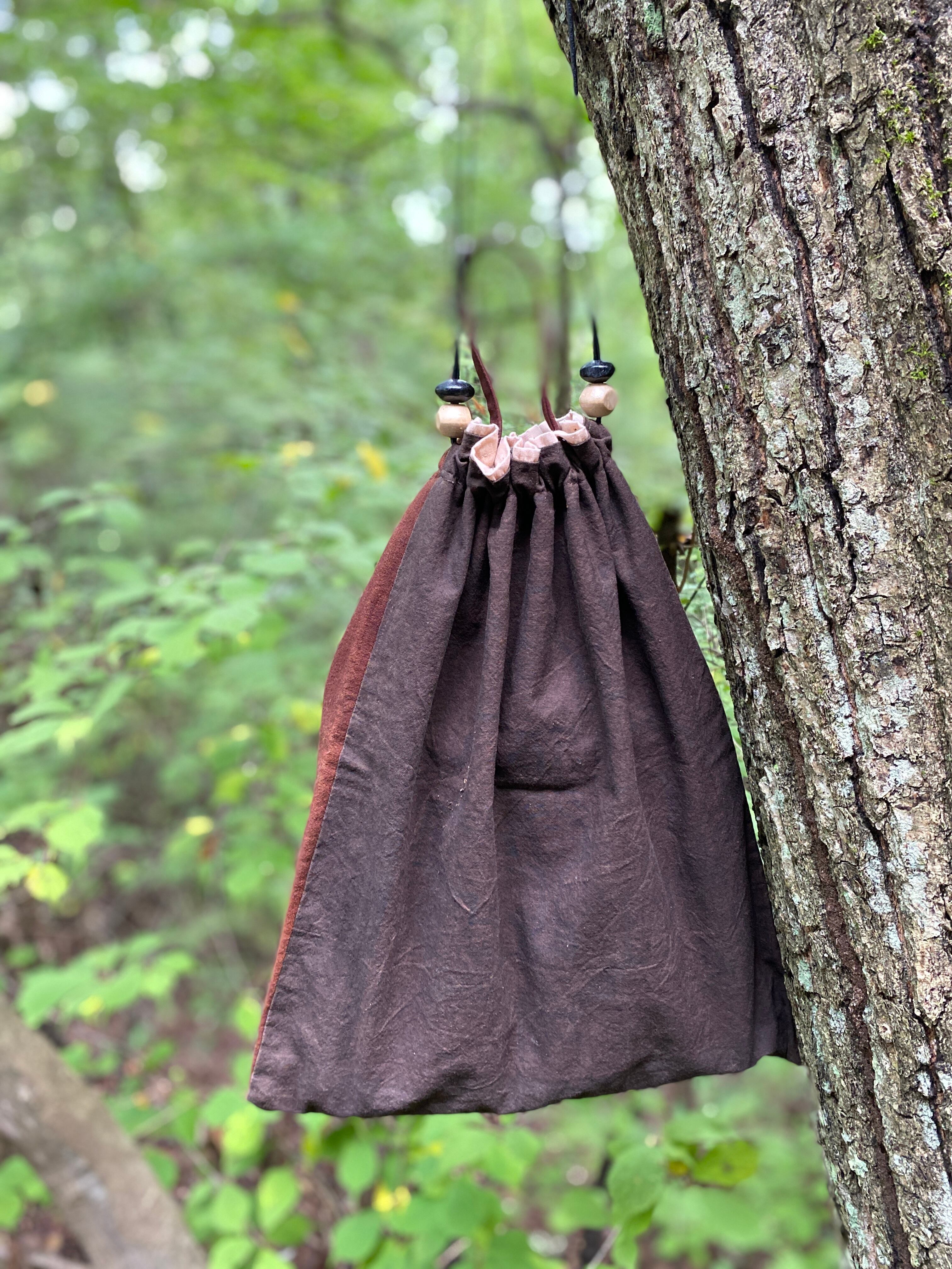 アマゾンの泥染めの黒と焦茶で、片側にワンポイントの刺繍が付いています。巾着袋にして持ち手もつけたのでぶら下げやすく、革の丸紐で滑らかです。